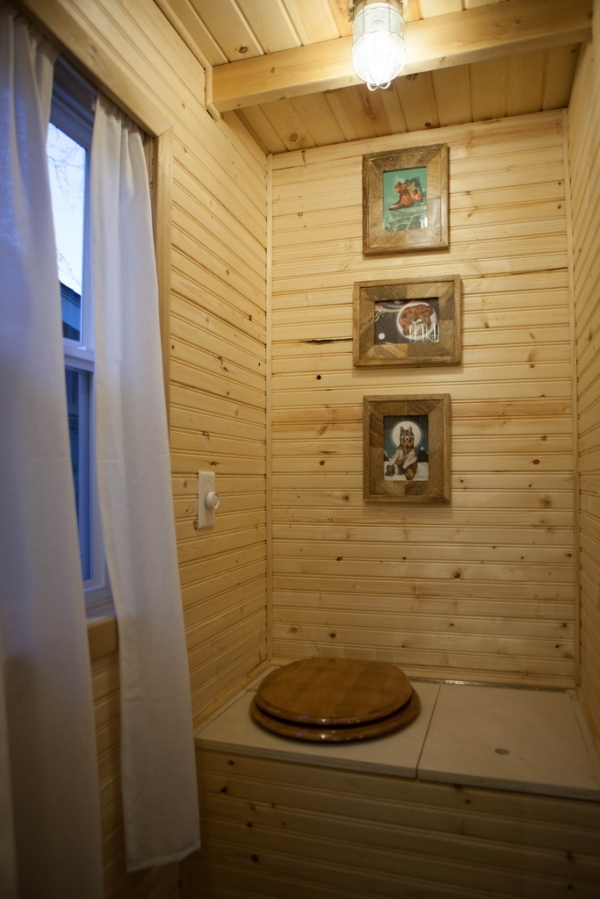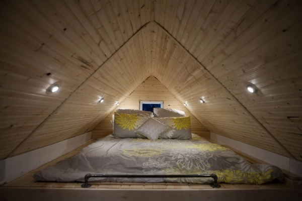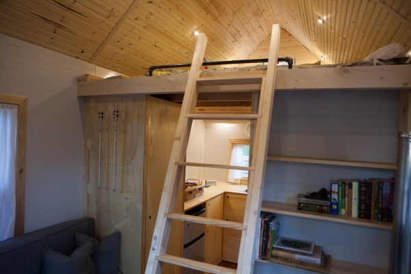 La madera continúa en el interior de la casa y hay una escalera que conduce a la zona de descanso. Jamison utilizó luces LED en toda la casa, añadiendo una buena dosis de eficiencia a esta pequeña Tiny House de jardín. Las paredes blancas que complementan a la madera están pintadas con tableros de cuentas, asegurándose de que la Tiny House se mantenga intacta durante el viaje. Una excelente estantería empotrada llena una pared, proporcionando almacenamiento, y las flechas decoran otra, añadiendo un poco de decoración a la zona de estar.