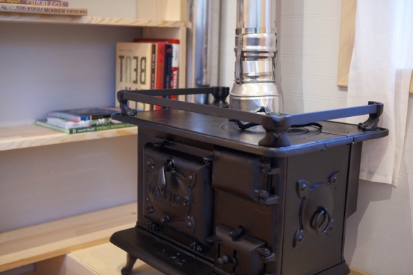 Una sorprendente estufa proporciona una opción adicional para cocinar y aporta un poco de encanto vintage a la casa.
