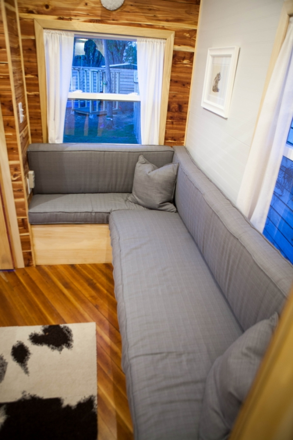 La zona de estar de esta Tiny House es muy cómoda y está muy bien hecha. El sofá se convierte en una cama de matrimonio, el suelo es de madera recuperada y la alfombra de imitación de piel de vaca le da un toque especial.